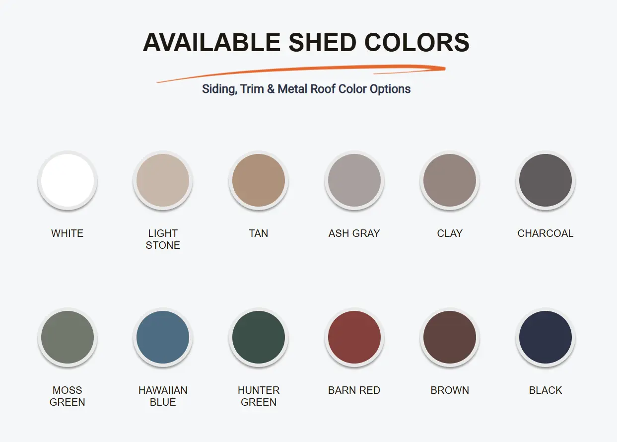 | Shed Trim Color | Ash Gray, Barn Red, Black, Brown, Charcoal, Clay, Hawaiian Blue, Hunter Green, Light Stone, Moss Green, Tan, White |