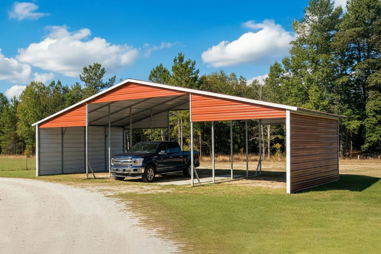 This 42x20x9 Metal Barn keeps your vehicles or storage items clean, dry, and out of the sun and rain, while still being easily accessible. This 42×20 semi-enclosed red steel barn has a 18x20x9 center with two 12x20x6 lean-to’s on either side. Whether you need vehicle storage or hay bale and tractor shelter, this 42x20 pull through barn is an ideal solution.
