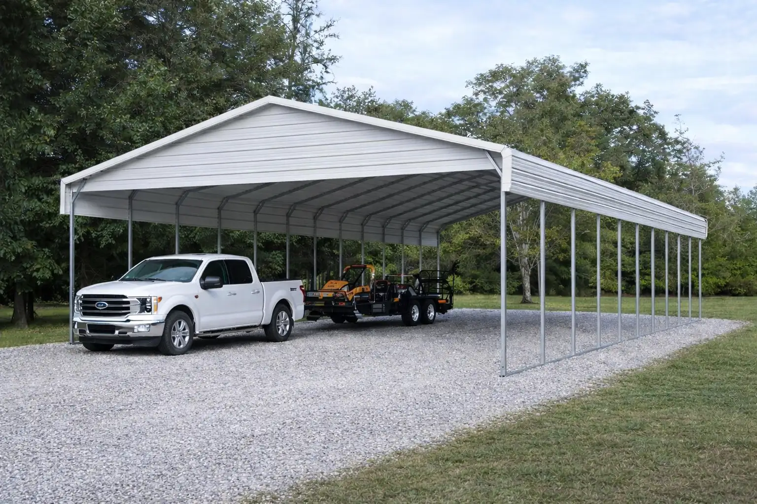 This 26x45 Metal Carport is available with $0 down financing and rent-to-own no credit check options. This carport is a open metal structure, enabling convenient parking and easy access without the hassle of opening or closing doors.