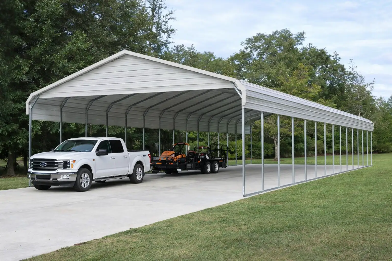 This 26x50 Metal Carport is available with $0 down financing and rent-to-own no credit check options. This carport is a open metal structure, enabling convenient parking and easy access without the hassle of opening or closing doors.Carport Roofing Styles