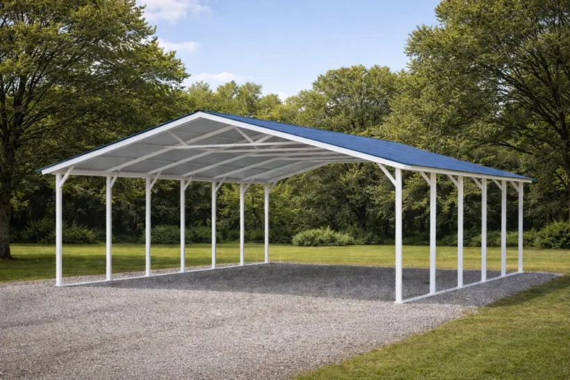 A horizontal roof metal carport features roof panels running end-to-end. This budget-friendly design is ideal for open areas and offers basic protection from sun and weather. It's less expensive due to the simpler engineering and fewer structural components required.