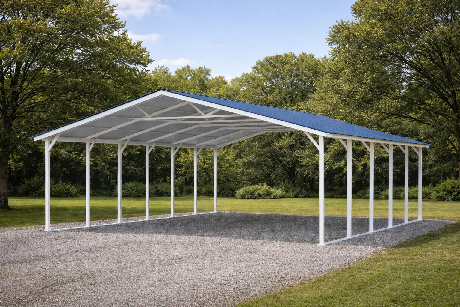 This 28x25 Metal Carport is available with $0 down financing and rent-to-own no credit check options. This carport is a open metal structure, enabling convenient parking and easy access without the hassle of opening or closing doors.
