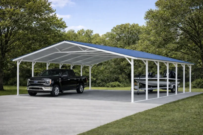 This 28x35 Metal Carport is available with $0 down financing and rent-to-own no credit check options. This carport is a open metal structure, enabling convenient parking and easy access without the hassle of opening or closing doors.Carport Roofing Styles