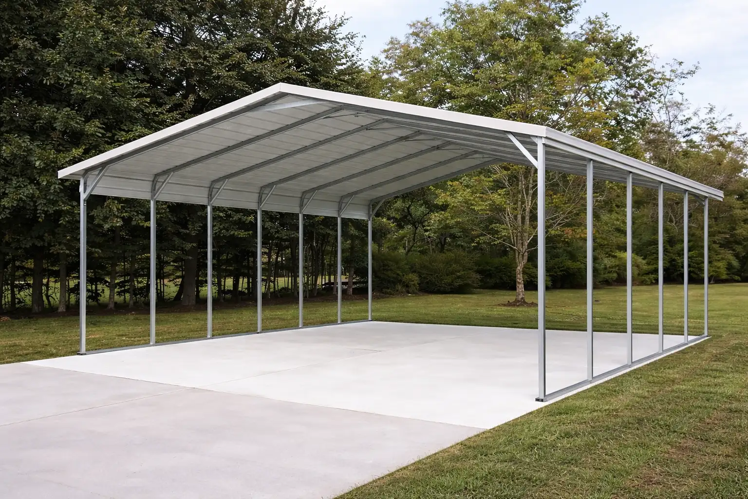 A horizontal roof metal carport features roof panels running end-to-end. This budget-friendly design is ideal for open areas and offers basic protection from sun and weather. It's less expensive due to the simpler engineering and fewer structural components required.