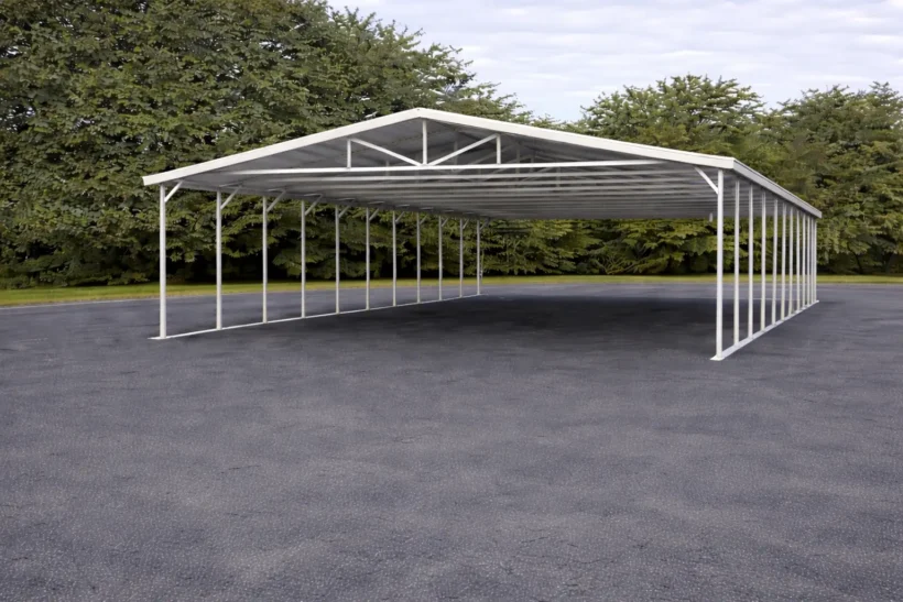 This 32x50 Metal Carport is available with $0 down financing and rent-to-own no credit check options. This carport is a open metal structure, enabling convenient parking and easy access without the hassle of opening or closing doors.Carport Roofing Styles