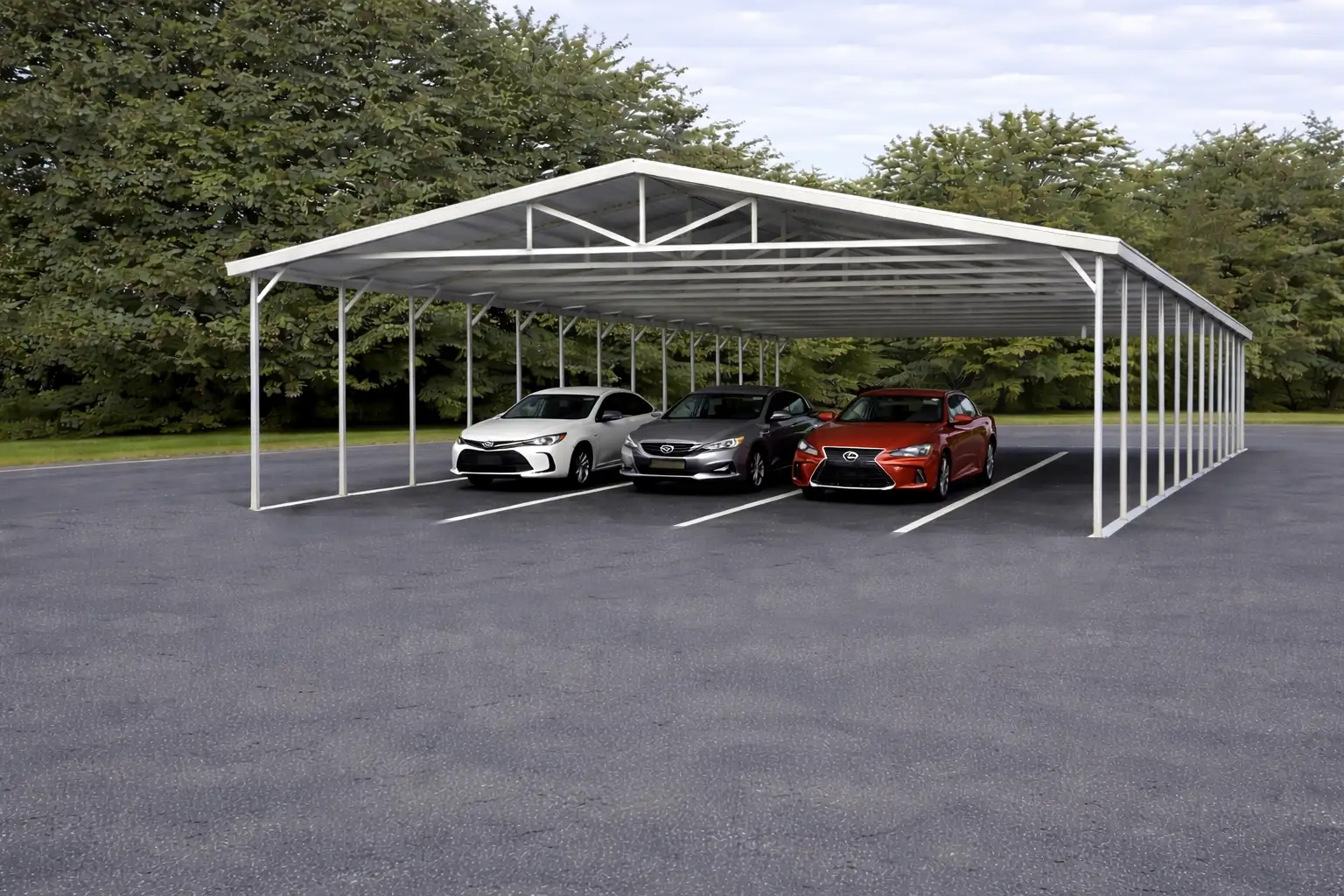 This 32x60 Metal Carport is available with $0 down financing and rent-to-own no credit check options. This carport is a open metal structure, enabling convenient parking and easy access without the hassle of opening or closing doors.Carport Roofing Styles