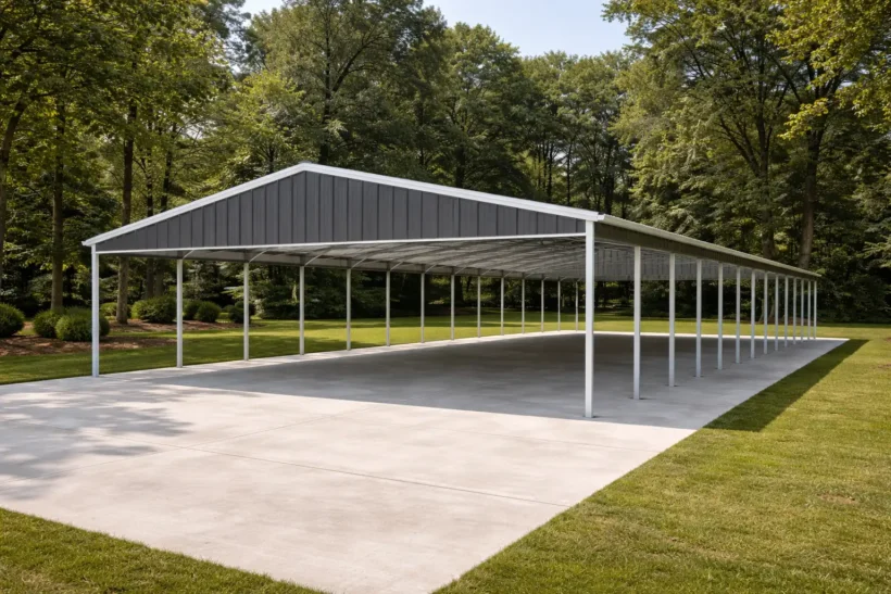 A horizontal roof metal carport features roof panels running end-to-end. This budget-friendly design is ideal for open areas and offers basic protection from sun and weather. It's less expensive due to the simpler engineering and fewer structural components required.