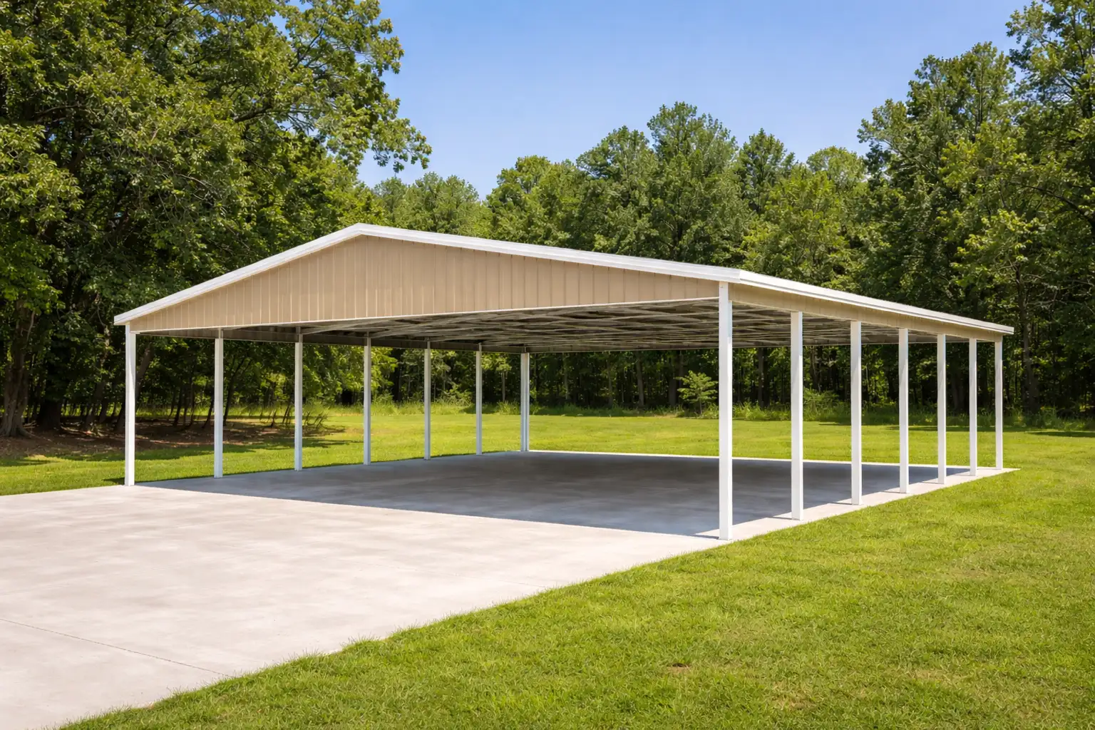 This 36x50 Metal Carport is available with $0 down financing and rent-to-own no credit check options. This carport is a open metal structure enabling convenient parking and easy access without the hassle of opening or closing doors.Carport Roofing Styles