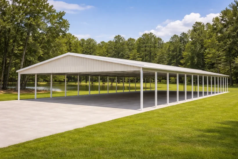 This 38x90 Metal Carport is available with $0 down financing and rent-to-own no credit check options. This carport is a open metal structure enabling convenient parking and easy access without the hassle of opening or closing doors.