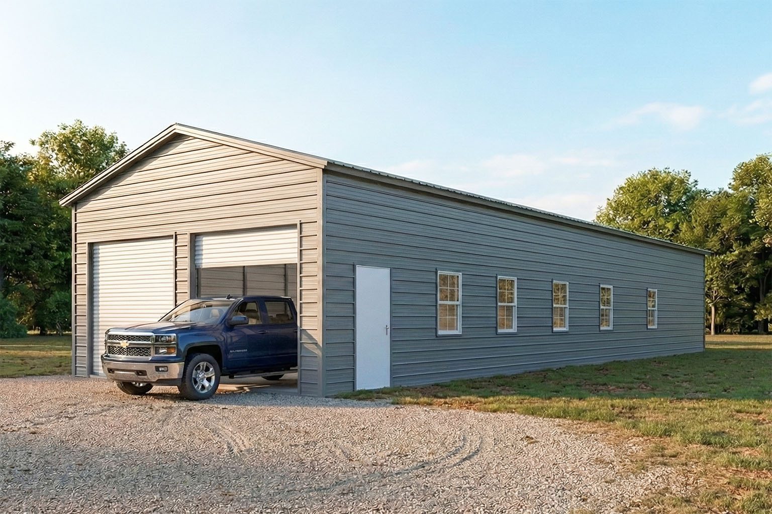 This 30x100x12 Steel Building is a great workshop or garage shop combo. This 30×100 Building included 2 Roll-up door, 1 walk-in door, and 5 windows.