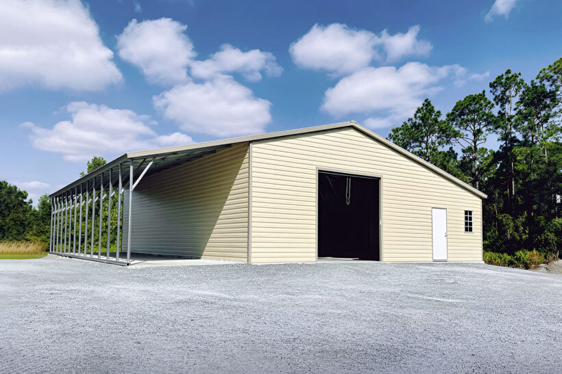 This 30x60x12 Metal Barn is one of our best garages. This building features the following: 30×60 metal building, 12′ open lean-to, 12′ enclosed lean-to, 10×10 roll-up garage door, walk-in door and window.