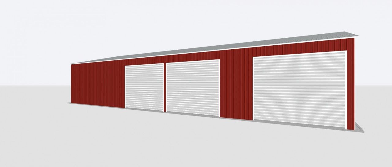 This 40x80x14 Metal Garage is one of our best garages. This building features the following: (1) 10×10 Chain Drive Roll up door, (3) 14×12 Chain Drive Roll up doors, (2) Windows, and (1) Walk door.