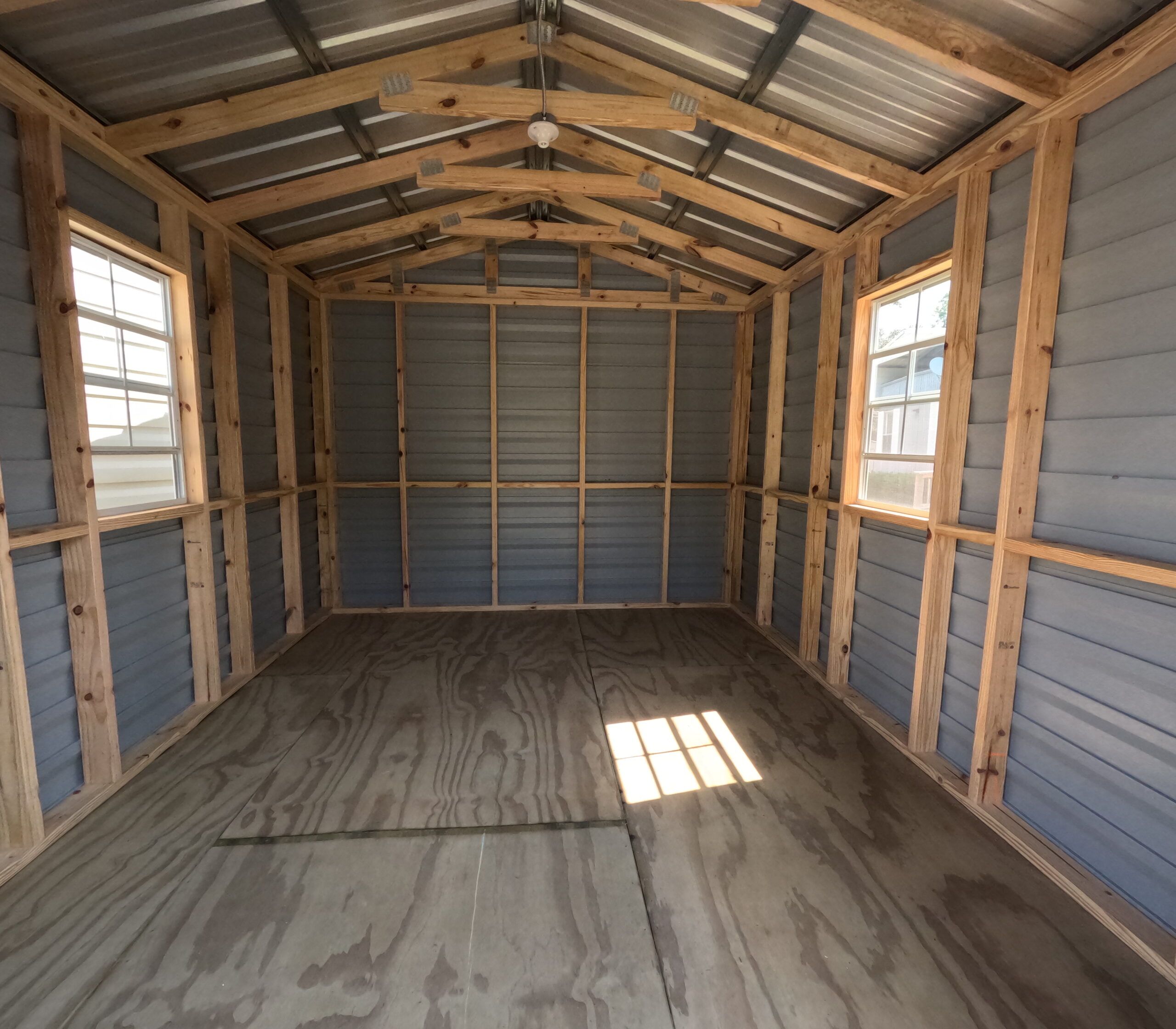 - Interior Upgrades: Air conditioner or window cut-out with complete trim out, Insulated floor: Astro foil between joists and plywood, Insulated walls and ceiling: Astro Foil between framing and siding, Interior Partition wall with 7/16" OSB on one side only (per Ln. Ft), Loft with 2x4 supports and 3/4" plywood deck (per Sq Ft), 12" Shelving (per Ln. Ft), 24" Shelving (per Ln. Ft), 36" Shelving (per Ln. Ft)