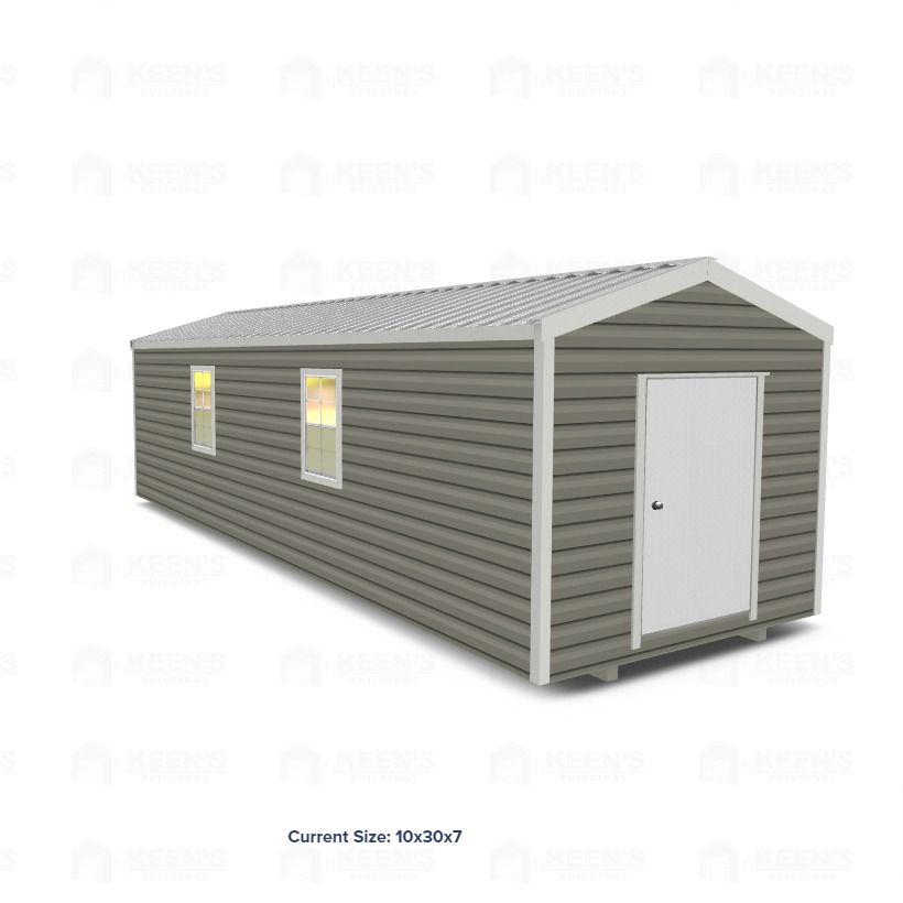 This 10×30 Storage Shed comes with (1) 48″x72″ insulated door, (4) 22″x36″ windows and standard wiring package of one light, one switch and one receptacle at the door.