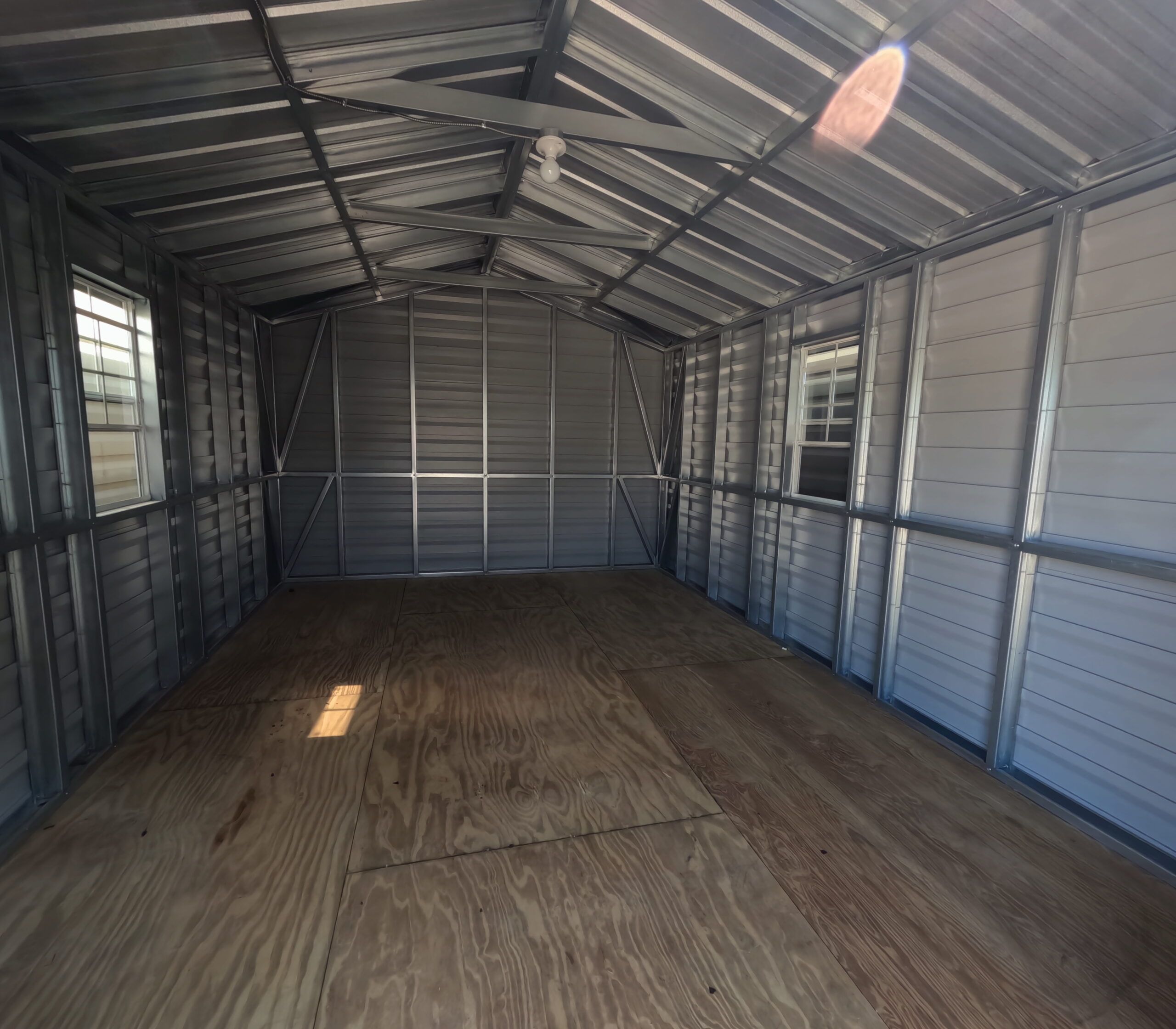 - Other Upgrades: Tie down straps, galvanized steel (minimum of 4 per building), 16" Exhaust fan with guard, automatic shutter, thermostat, and switch