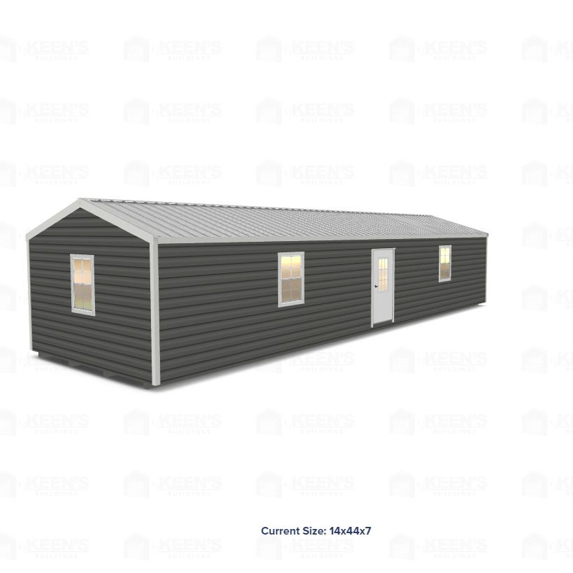 This 14×44 Storage Shed comes with (1) 36″x72″ 9lite door, (4) 22″ x 36″ windows, standard wiring package of one light, one switch, and one receptacle at the door.