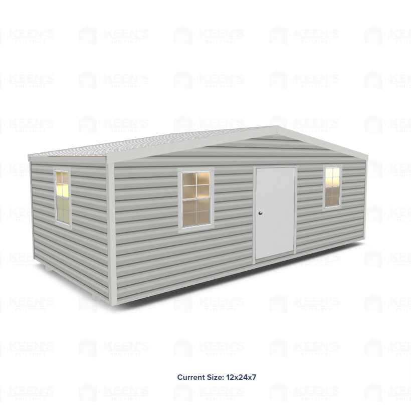 This 24×12 Storage Shed comes with (1) 48″x72″ insulated door, (4) 22″x36′ windows, standard wiring package of one light, one switch, and one receptacle at the door.