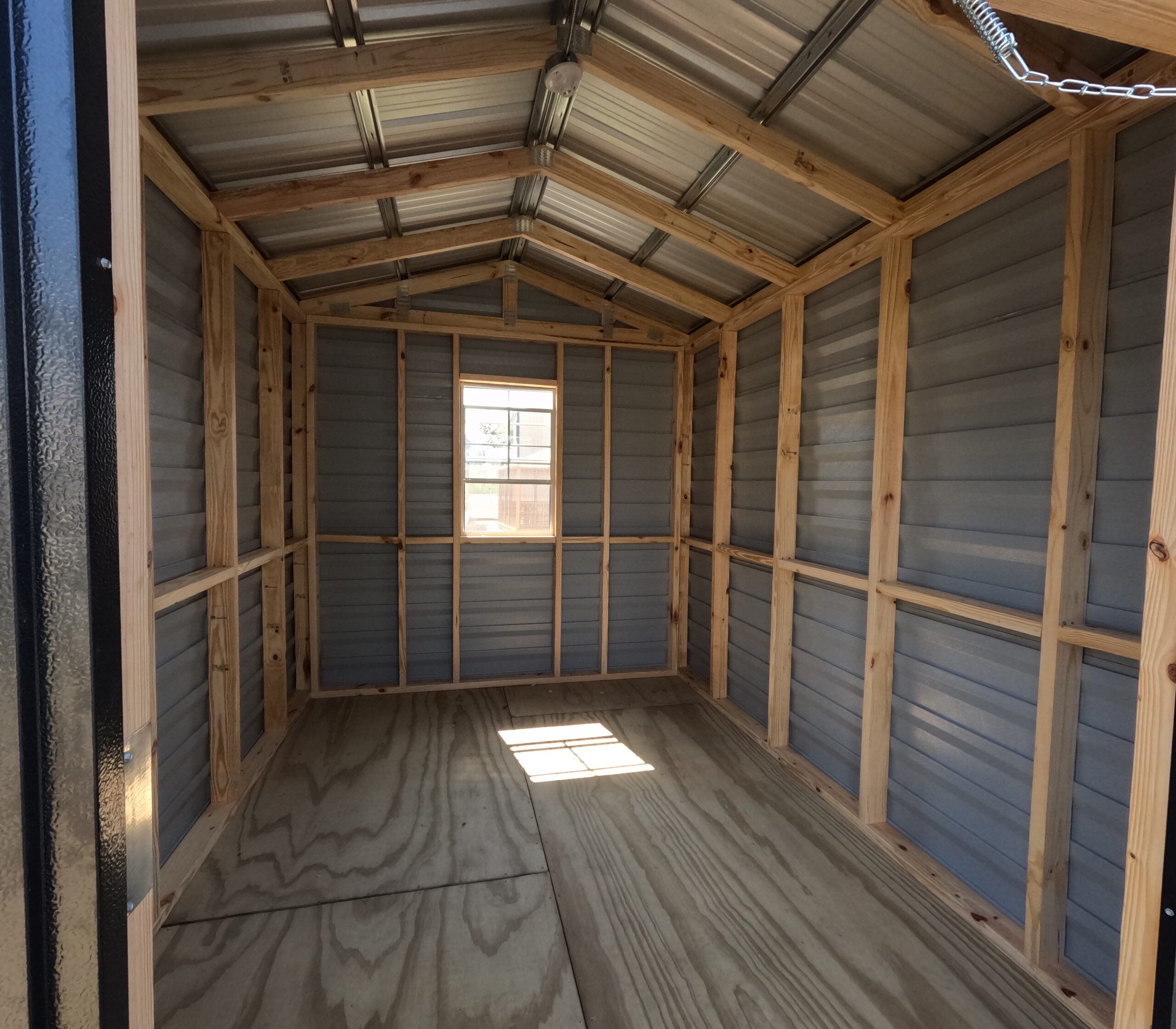 This 8x10Storage Shed comes with (1) door, (1) window, standard wiring package of one light, one switch, and one receptacle at the door.