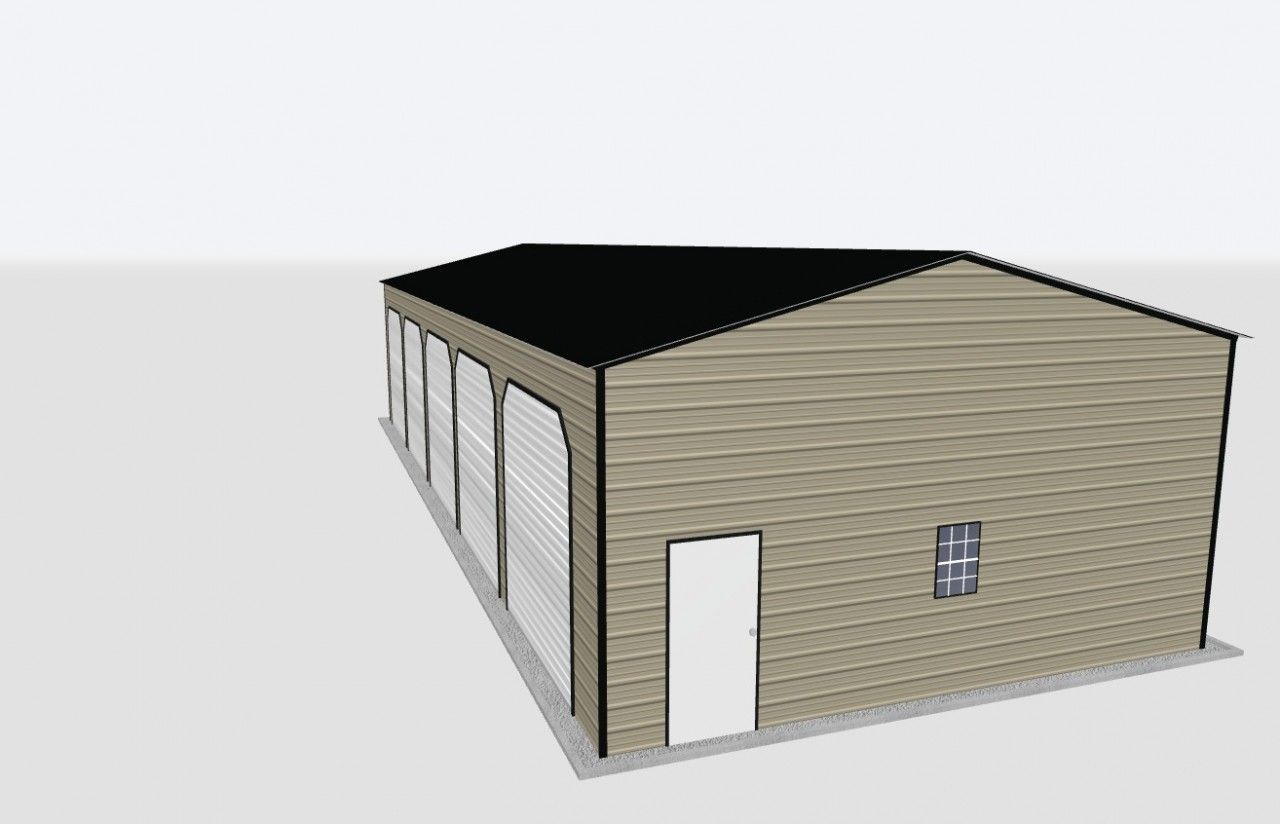 This 24x60x12 Metal Garage is one of our best garages. This building features the following: (5)10×10 Chain-Drive Roll up doors and (1) 36”x 80” Walk-In Door and, (1) Window 24″x 36″.